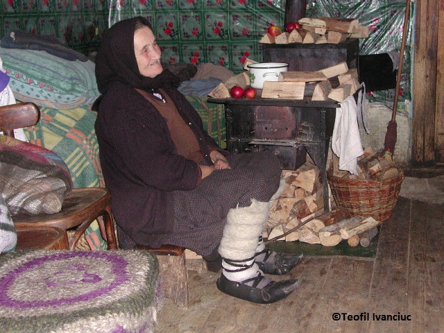 Old lady beside the wooden stove